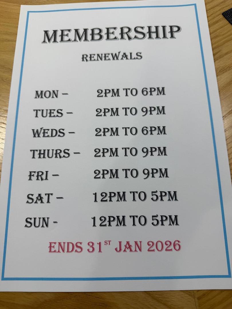 To all our members, its that time of year when your membership is up for renewal, these are the times that you are able to renew.